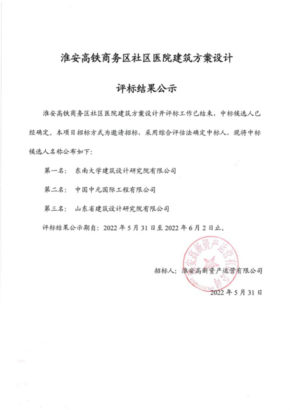 淮安高鐵商務(wù)區社區醫院建筑方案設計評標結果公示